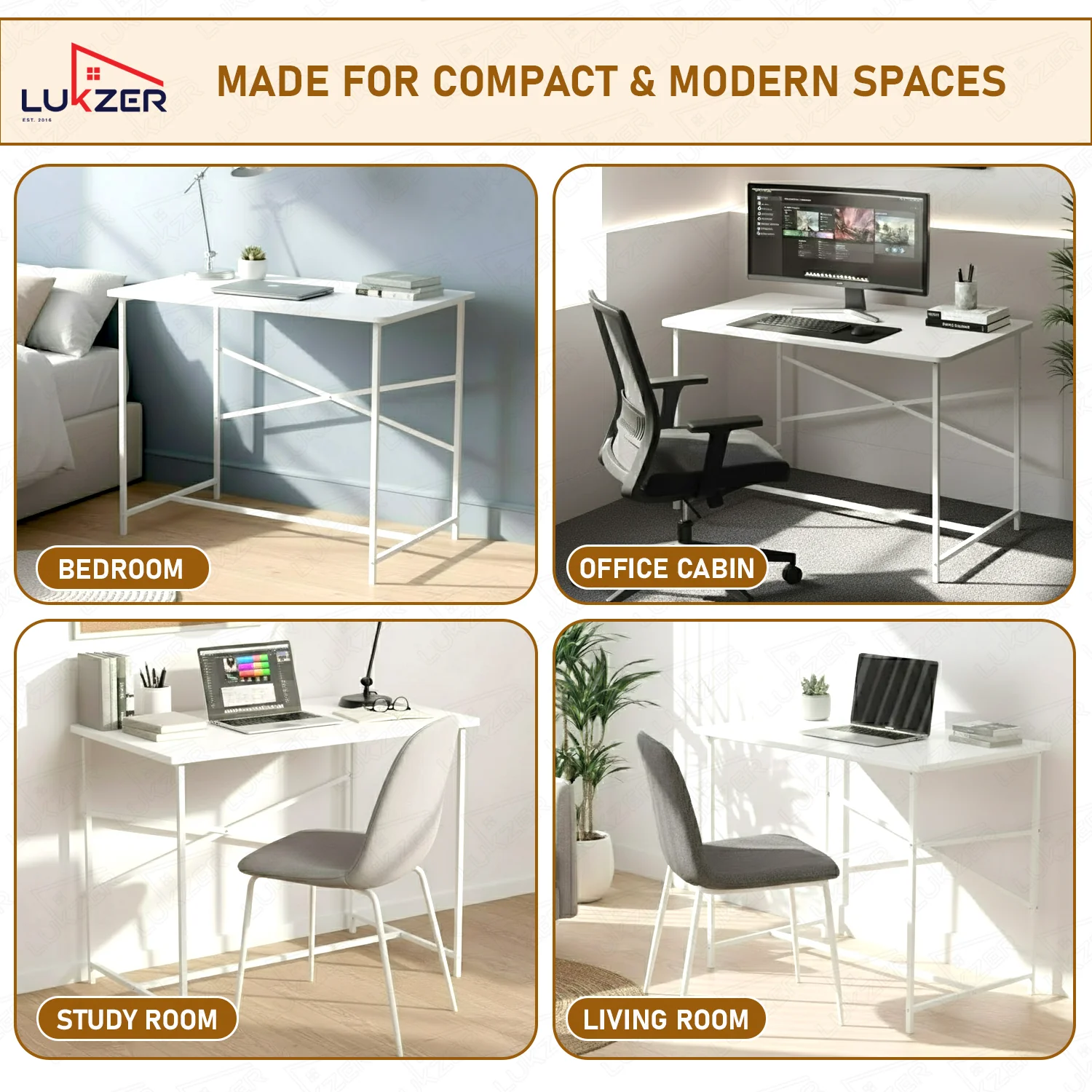 Upgrade your workspace with the Lukzer Study Table, designed for students, professionals, and work-from-home setups. Built with a premium engineered wood top and a strong metal frame, this desk offers a stable, spacious, and smooth surface for laptops, books, writing, and daily tasks. The reinforced X-support ensures reduced wobbling, while the ergonomic 73 cm height provides comfortable posture during long study or work hours. With a generous 90×60 cm tabletop, you get ample room to organize your essentials without clutter. Its clean, modern design fits perfectly in bedrooms, home offices, hostels, and compact apartments. Available in four elegant color combinations—White & White, White & Oak Brown, Black & Black, and Black & Oak Brown—to match any interior. The table is easy to assemble with all hardware included, making it a convenient and durable addition to your home or office.